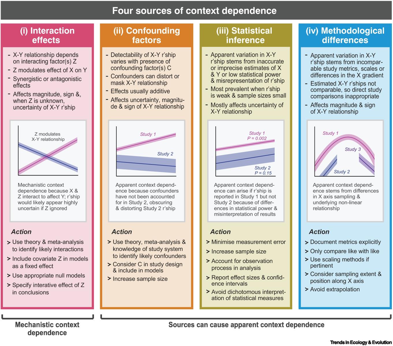 虽然我们无法彻底抛弃这一概念,但至少可以对context dependence进行定义和分类。Catford et al. (2022) 的文章 Addressing context dependence in ecology: Trends in Ecology & Evolution 对此进行了探讨,指出情景依赖性可以被分为四个基本的类别,即多个因素之间的交互效应、混杂因素、统计显著性和方法差异。